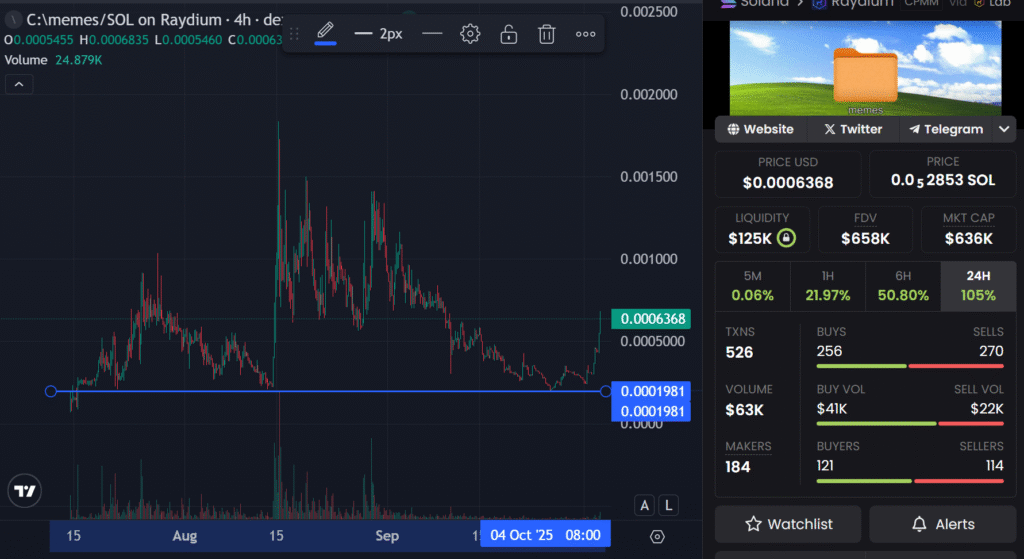 is a Solana memecoin with nostalgic “Windows folder” branding. It’s heavily community-driven: meme culture, light humor, and small mini-utilities (e.g., a Telegram coinflip game) keep engagement up. Over the last 24 hours we saw an aggressive momentum spike: +86% on the day, with two sharp expansions to ~0.000472 and ~0.000688, and a higher close — a sign buyers controlled most of the session.