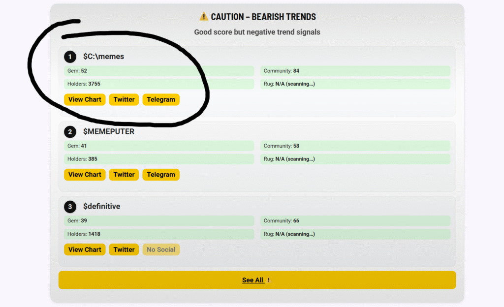 Live Feed / Daily Insights already gives you the quality context (Gem/Community) and a trend label (Caution).